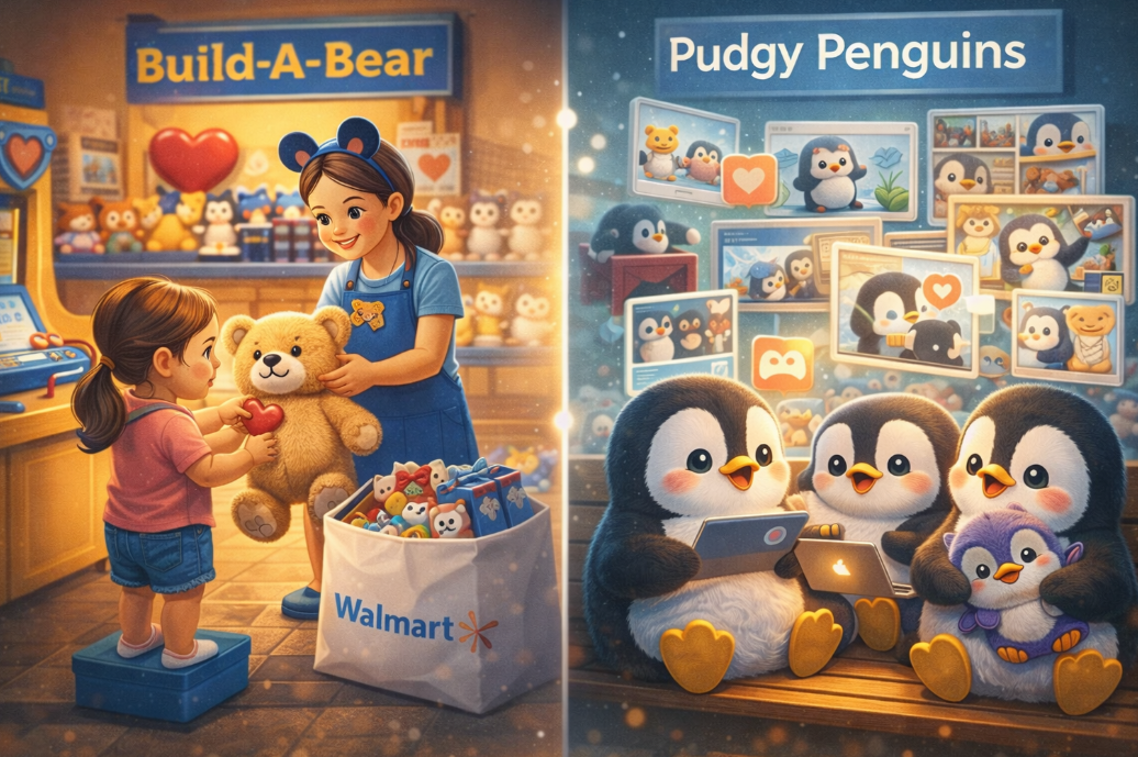 Ngoài ra, Build A Bear có các cửa hàng, kênh bán hàng hoạt động độc lập, không tạo ra hiệu ứng mạng lưới giữa người tiêu dùng. Khách hàng mua sản phẩm nhưng cũng chỉ là yêu thích chứ không trở thành một phần của hệ sinh thái bên trong. Ngược lại đối với Pudgy Penguins thì giá trị cốt lõi không nằm ở việc bán bao nhiêu thú nhồi bông mà ở quyền sở hữu và khả năng khai thác IP nhân vật. IP này có khả năng License gần như vô hạn sang đồ chơi, Game, sách,... và các nền tảng đối tác khác nhau. Đặc biệt, Pudgy Penguins còn sở hữu một cộng đồng tự tạo nội dung, Meme, ... một cách miễn phí, đây là điều hiếm khi xảy ra trong thế giới thực