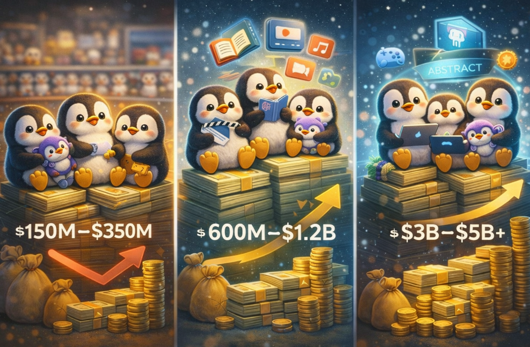 Đây là kịch bản tích cực nhất phản ánh viễn cảnh tham vọng nhất của Pudgy Penguins, khi dự án không chỉ dừng lại ở một thương hiệu nhân vật tiêu dùng mà tiến hóa thành một mô hình kết hợp giữa IP và Platform tương tự như cách Disney xây dựng cả một hệ sinh thái xoay quanh các nhân vật của mình, nhưng được hỗ trợ bởi hạ tầng Web3 ở phía dưới. Trong kịch bản này, doanh thu hằng năm có thể vượt mốc 300 triệu USD không chỉ đến từ việc bán sản phẩm hay cấp quyền sử dụng IP mà còn từ phần giá trị được trích xuất trực tiếp từ các hoạt động kinh tế diễn ra trong toàn bộ hệ sinh thái Pudgy Penguins và Abstract
