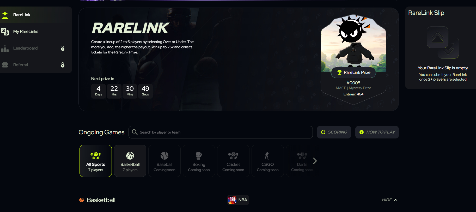 - Cơ chế RareLink Prize tích hợp: Mỗi cầu thủ thêm vào Lineup mang lại một vé tham gia rút thăm giải thưởng hàng tuần (như NFT, ví Hardware Ledger, hoặc Mystery Prize), giúp tăng cơ hội trúng thưởng phụ bên cạnh Payout từ đặt cược chính, khuyến khích tạo Lineup lớn hơn.