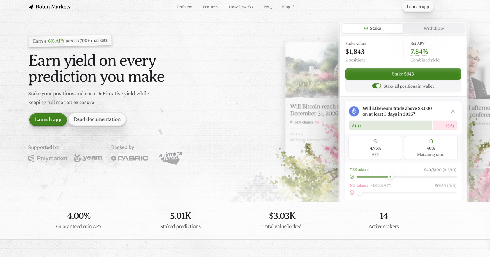 Robin Markets là một Protocol được thiết kế để tối ưu hóa hiệu quả sử dụng vốn cho người dùng tham gia vào các thị trường dự đoán. Trong các nền tảng dự đoán truyền thống, nguồn vốn của người dùng thường bị khóa trong các vị thế chờ đợi kết quả diễn ra trong thời gian dài, dẫn đến tình trạng lãng phí cơ hội sinh lời từ số tiền nhàn rỗi đó. Dự án này giải quyết bài toán trên bằng cách cho phép người dùng Stake các vị thế dự đoán của mình để nhận về lợi nhuận thụ động mà không làm mất đi quyền kiểm soát đối với kết quả dự đoán ban đầu.