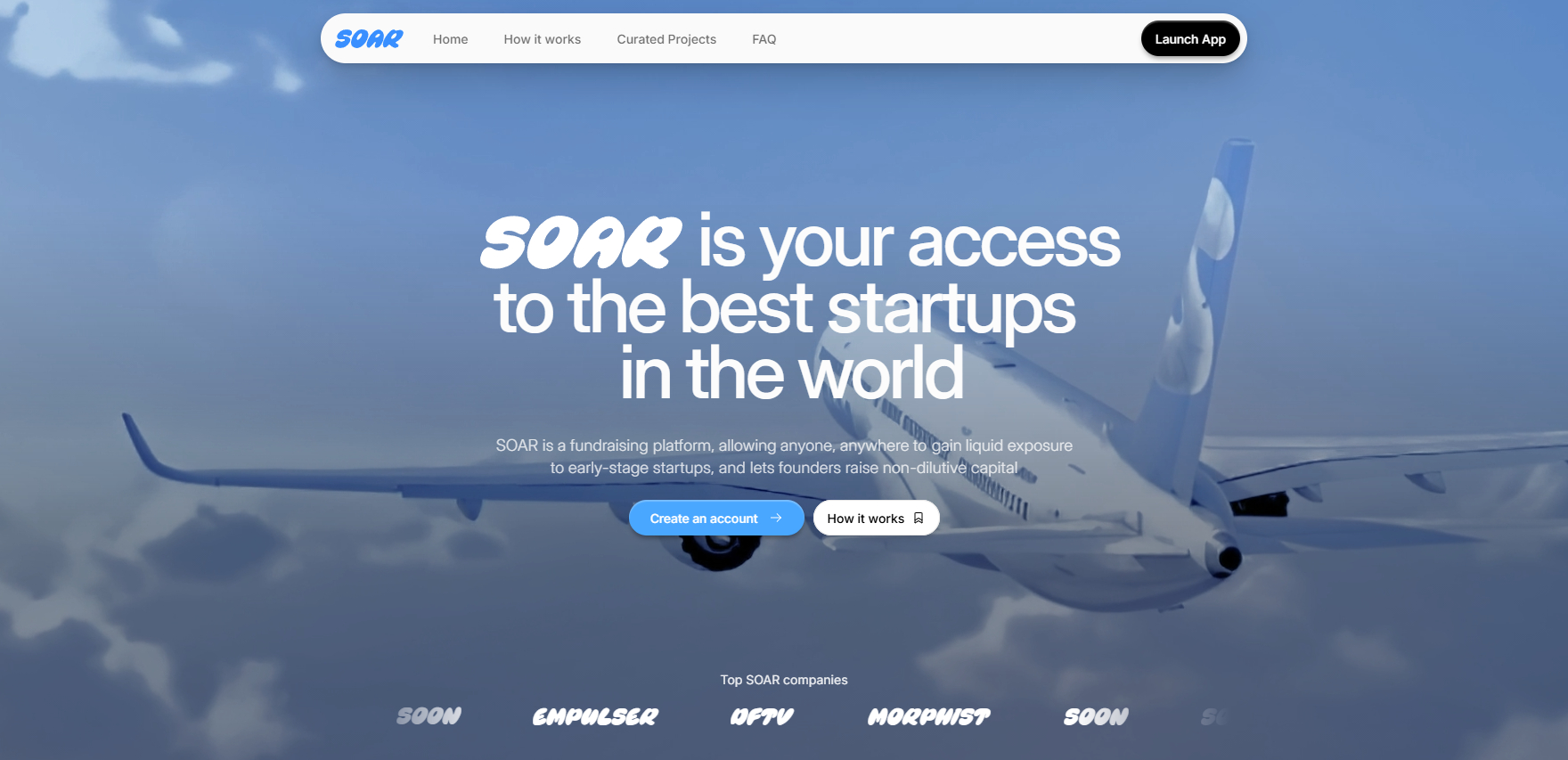 LaunchOnSoar là một nền tảng Launchpad trong thị trường Crypto, hoạt động với mục tiêu chính là giúp các Startup Raise Capital On-chain theo cách Non-dilutive, nghĩa là Founder không phải pha loãng quyền sở hữu Equity. Nền tảng cho phép bất kỳ ai trên thế giới tham gia tiếp cận Liquid Exposure đến các dự án Early-stage Startup đã được Curate. Các Startup có thể giữ toàn bộ quyền kiểm soát dự án trong khi tiếp cận nguồn vốn toàn cầu theo thời gian thực.