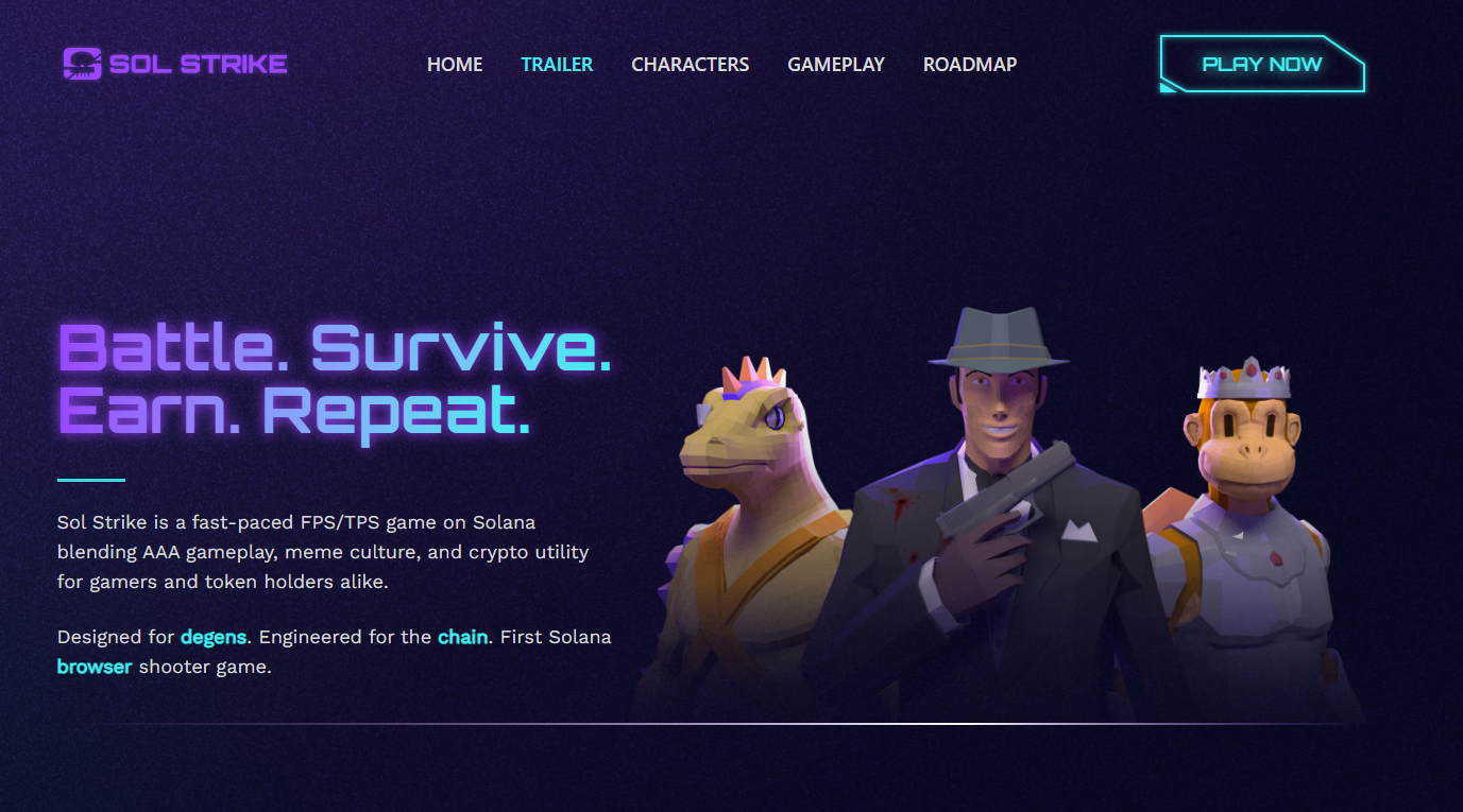 Sol Strike là trò chơi bắn súng FPS/TPS đầu tiên chạy trực tiếp trên trình duyệt và xây dựng hoàn toàn trên Solana. Dự án kết hợp giữa yếu tố Gameplay tốc độ cao, văn hóa Meme và cơ chế kinh tế trong Crypto, tạo nên trải nghiệm Game Play To Earn với các Game thủ Web3, Holder token Meme và cộng đồng Degen.