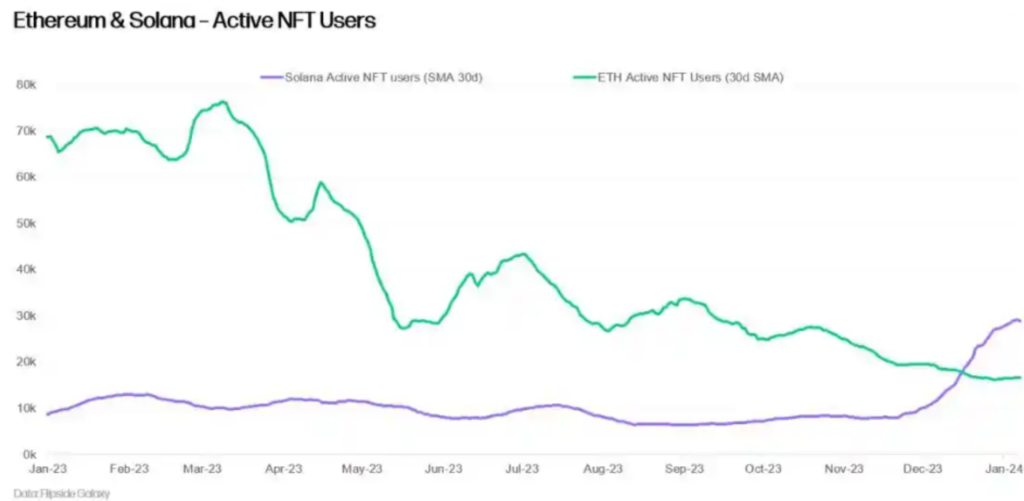 Khi xét về sự tăng trưởng về số lượng người dùng trên hai Blockchain này thì vào năm 2023, số lượng người dùng NFT trên Ethereum đã chứng kiến sự sụt giảm mạnh 73% trong khi số lượng người dùng NFT trên Solana lại chứng kiến sự tăng trưởng 200% và vượt qua cả Ethereum vào tháng 12/2023.