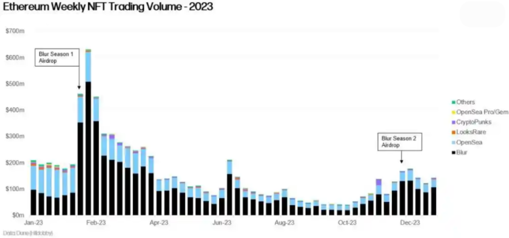 Tuy nhiên, kể từ ngày 09/10/2023 thì chúng ta đã thấy một sự thay đổi đáng kể khi khối lượng giao dịch NFT hàng tuần trên Ethereum đã chứng kiến sự tăng trưởng đáng kinh ngạc 380%. Sự gia tăng mạnh mẽ này chủ yếu đến từ đợt airdrop Blur Season 2 diễn ra vào ngày 20/11/2023. Blur khuyến khích người dùng đặt giá thầu, listing và cho vay NFT trên nền tảng của họ để nhận được phần thưởng airdrop là token BLUR. Điều này đã thúc đẩy các nhà giao dịch NFT tích cực tham gia giao dịch vào các tuần trước khi Blur Season 2 kết thúc và từ đó giúp thị trường NFT trên Ethereum trở nên sôi động trở lại.