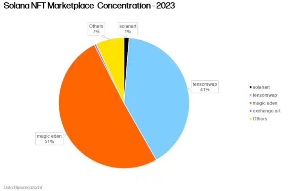 Khi xét đến Solana thì vào năm 2023, Magic Eden là nền tảng NFT Marketplace thống trị trên Solana với khoảng 51% về thị phần khối lượng giao dịch. Xếp ở vị trí thứ hai trong danh sách này là Tensor với 41% về thị phần khối lượng giao dịch.