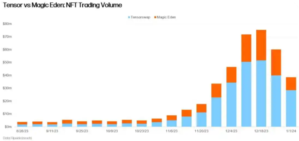 Mặc dù Magic Eden là người đến trước và thống trị trên Solana nhưng trong thời gian gần đây, đặc biệt là giai đoạn cuối năm 2023 thì khối lượng giao dịch trên Tensor đã vượt trội hơn Magic Eden. Từ ngày 01/10/2023 đến ngày 01/01/2024, khối lượng giao dịch NFT trên Tensor đã vươn lên dẫn đầu với khối lượng giao dịch NFT cao hơn 50% so với Magic Eden.