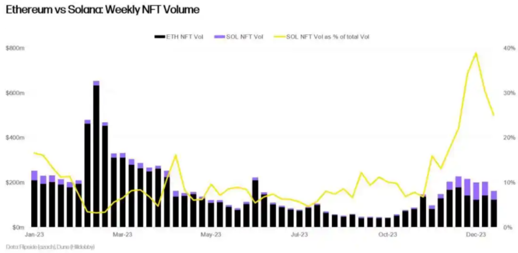 Vào năm 2023, Ethereum thống trị không gian NFT với hơn 90% thị phần về khối lượng giao dịch NFT hàng tuần trong khoảng 60% thời gian của năm. Một điều lưu ý là số liệu này chưa bao gồm khối lượng giao dịch Ordinals và BRC 20 trên Bitcoin và bài viết này chỉ tập trung vào hai thị trường giao dịch NFT Solana và Ethereum.