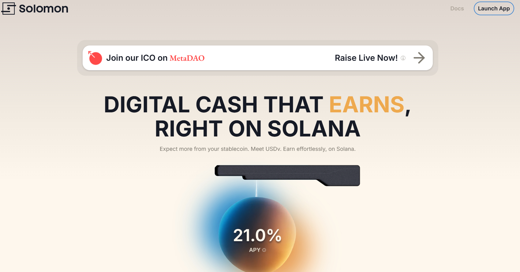 Solomon là nền tảng Stablecoin sinh lợi nhuận cho người dùng trên Blockchain Solana, được xây dựng để người dùng có thể stake USDv để lấy sUSDv từ đó kiếm lợi nhuận từ hoạt động của Solomon. Dự án nhấn mạnh việc tích hợp Yield trực tiếp vào Stablecoin, giúp người dùng kiếm 20%+ APY trên Stable Assets mà không cần di chuyển tài sản giữa các giao thức.