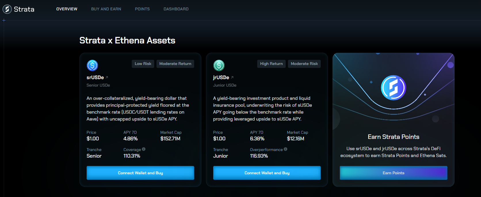 Strata là một sản phẩm lợi suất cung cấp các Structured Products trên USDe, Stablecoin tổng hợp của Ethena được hỗ trợ bởi các vị thế Delta-Neutral. Dự án cho phép nhà đầu tư tùy chỉnh mức rủi ro - lợi nhuận (Risk-Return Preference) và kiếm lợi nhuận từ các giao dịch Carry và Basis thông qua hai lớp rủi ro: Senior và Junior. Giao thức giới thiệu hai Liquid Token có thể kết hợp được xây dựng trên sUSDe, bao gồm Strata Senior USDe (srUSDe) và Strata Junior USDe (jrUSDe).