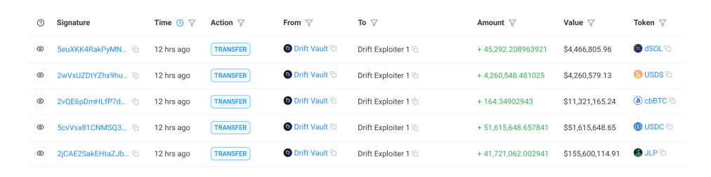 Ngay sau đó, Hacker đã liên tục chuyển Token với tần suất cực cao. Hàng chục triệu Token đã được các Hacker chuyển đi chỉ trong vòng vài giây và chỉ trong nửa ngày sau đó, số tiền nắm giữ trong Treasury chính của Drift đã giảm mạnh từ 312 triệu USD xuống chỉ còn 7.8 triệu USD