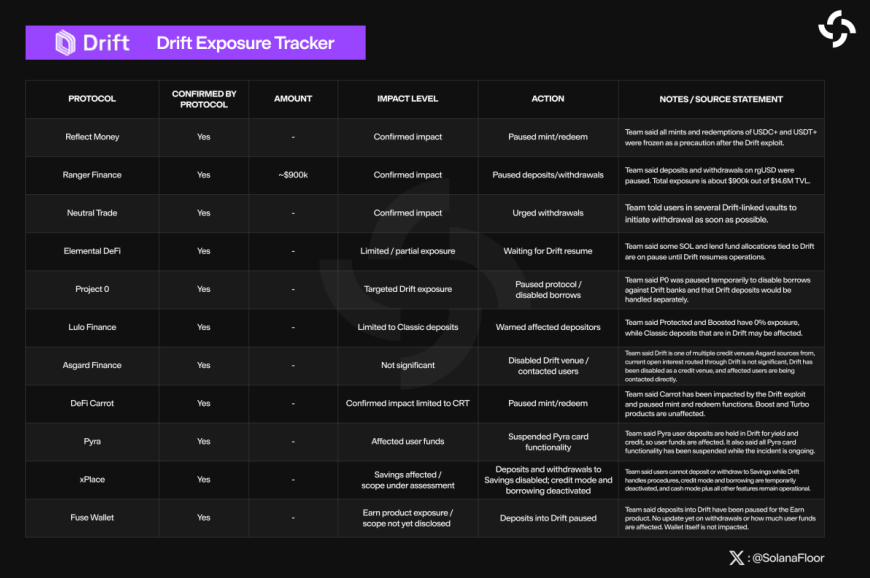 - Ranger Finance: 4 Vault được phân bổ cho các chiến lược Earn dựa trên Drift đã bị ảnh hưởng với Vectis DriftPack Vault thiệt hại 428.000 USD, Ranger USD thiệt hại 249.000 USD, Elemental USDC Lending thiệt hại 237.000 USD và Vectis Multi Lend thiệt hại 5000 USD. Tổng số tiền ảnh hưởng lên tới hơn 900.000 USD và Ranger Finance đã tạm dừng tất cả các giao dịch gửi và rút tiền cũng như tất cả các Vault hiện có trên Ranger.